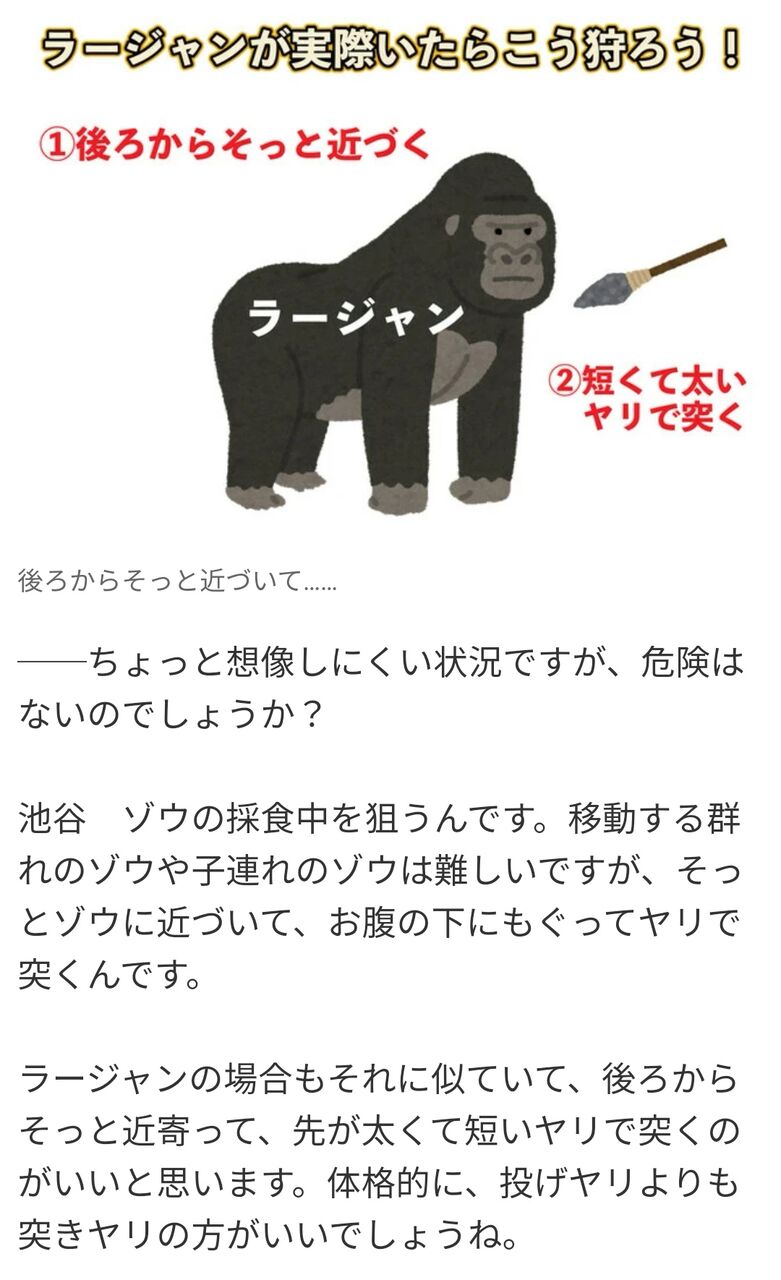 池谷「キリンの場合、まずは毒をぬった弓矢で射るんですね。現代の毒と違って昔のものは弱いので、キリンは2日ぐらいかけてゆっくり弱っていきます。で、その足跡を追いかけて、力尽きているところをヤリで仕留めるんです。」