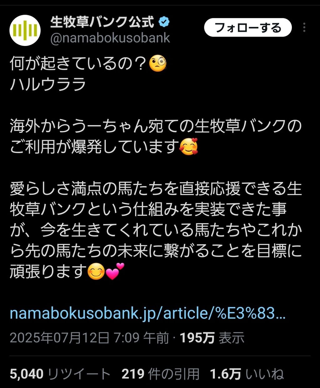 普段やっすい草食ってるところにうっめえ草送られるからお馬さんの食い付きすごいで